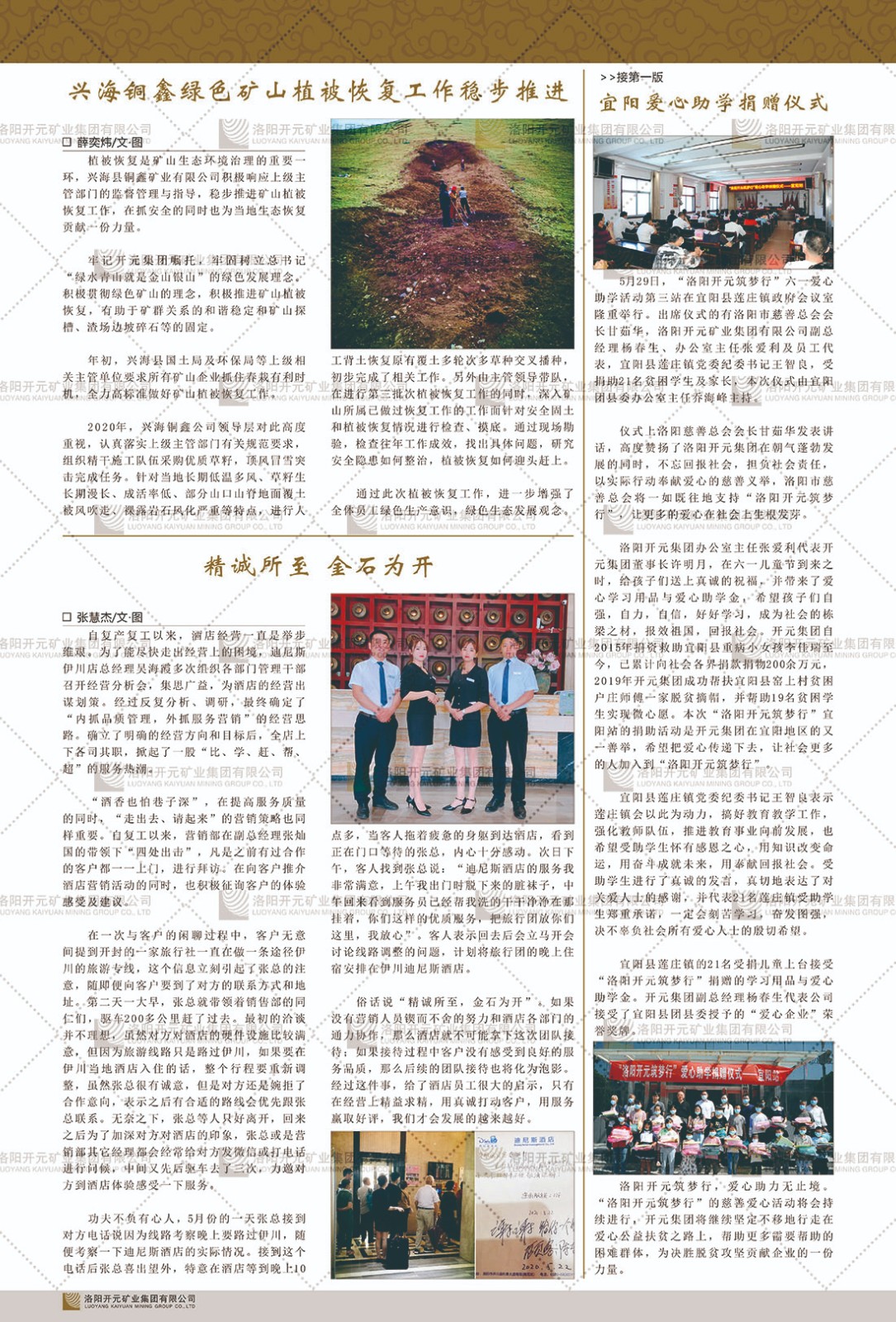 洛陽開元礦業(yè)集團(tuán)有限公司簡介洛陽開元礦業(yè)集團(tuán)有限公司,始成立于2006年,位于洛陽市開元大道269號(hào)。集團(tuán)旗下共有十余家全資子公司,業(yè)務(wù)涉及有色金屬礦山開發(fā)、礦產(chǎn)品購銷與進(jìn)出口貿(mào)易、房地產(chǎn)開發(fā)、文化藝術(shù)、企業(yè)管理與咨詢、資本投資等多個(gè)領(lǐng)域。2024年,集團(tuán)公司銷售總額達(dá)7.8億元。民建河南省委委員、民建河南省委企業(yè)委副主任、民建洛陽市委委員、企業(yè)委主任、洛陽民建企業(yè)家協(xié)會(huì)會(huì)長許明月是公司創(chuàng)始人,現(xiàn)任洛陽開元礦業(yè)集團(tuán)有限公司董事長。在礦業(yè)領(lǐng)域,洛陽開元礦業(yè)集團(tuán)擁有多家實(shí)力雄厚的子公司:貴州開元礦業(yè)有限公司探、采礦權(quán)面積共11.33平方公里;興海縣銅鑫礦業(yè)有限公司探礦權(quán)面積8.76平方公里,礦山資源潛力巨大;2021年,開元集團(tuán)與盧氏中科礦業(yè)有限公司開展戰(zhàn)略合作。盧氏中科礦業(yè)有限公司專注于有色金屬的浮選、加工和銷售,擁有強(qiáng)大的技術(shù)支撐平臺(tái),是集探、采、選、冶、研為一體的中大型綜合礦業(yè)企業(yè)。目前,盧氏中科王家河1000噸選礦廠已成功投產(chǎn),雙河金礦、柳關(guān)欒盧鉛鋅礦相繼順利開工,樓房銀礦與圪老灣鉛鋅礦的深部探礦重大突破,標(biāo)志著礦山版圖取得重大進(jìn)展,為開元集團(tuán)后續(xù)發(fā)展奠定了堅(jiān)實(shí)基礎(chǔ)。在文化傳媒領(lǐng)域,洛陽市明月美術(shù)館通過豐富多樣的藝術(shù)展覽、學(xué)術(shù)研討和公共教育活動(dòng),努力打造一個(gè)集展覽、交流、教育、研究為一體的綜合性藝術(shù)平臺(tái)。此外,在金融投資領(lǐng)域,開元集團(tuán)旗下的北京明峰資本管理有限公司專注于投資具有高增長潛力的優(yōu)秀企業(yè),特別是高科技、新能源、環(huán)保等新興產(chǎn)業(yè),為客戶提供個(gè)性化的資產(chǎn)配置服務(wù)。在做好企業(yè)經(jīng)營的同時(shí),開元集團(tuán)始終不忘企業(yè)的社會(huì)責(zé)任和家國情懷,以突出的愛心公益事跡,開展了一系列公益慈善活動(dòng):“民建林”公益事業(yè)通過“思源基金”“幫幫公益”線上公益平臺(tái),與眾多愛心人士籌措資金20余萬元;資助541名貧困大學(xué)生共計(jì)270余萬元,推進(jìn)“數(shù)字助力——河南AI人才培養(yǎng)”;捐款10萬元,馳援京津冀、黑龍江洪水地質(zhì)災(zāi)害……公司于2017年底被洛陽市慈善總會(huì)評(píng)為“洛陽慈善風(fēng)云榜——十大愛心集體”。洛陽開元礦業(yè)集團(tuán)有限公司秉承持續(xù)發(fā)展理念,憑借多年來良好的企業(yè)信譽(yù)與經(jīng)營業(yè)績,與全國多家企業(yè)建立了良好合作關(guān)系,受到社會(huì)各界的一致好評(píng),多次榮獲“納稅標(biāo)兵”“先進(jìn)企業(yè)”“招商引資模范企業(yè)”等榮譽(yù)稱號(hào)?;赝麃頃r(shí)路,開元人勠力同心,以“闖”的精神和“創(chuàng)”的勁頭,一路披荊斬棘,踏過千山萬水;展望新未來,開元人凝心聚力,不執(zhí)于“舊”,無畏于“新”,秉承“勇于跨越,追求卓越”的企業(yè)精神,乘著國家高質(zhì)量發(fā)展新征程的東風(fēng),跨過高山,越過大海,向著集團(tuán)多元化、國際化的目標(biāo),逐夢(mèng)遠(yuǎn)航,跨越前行!