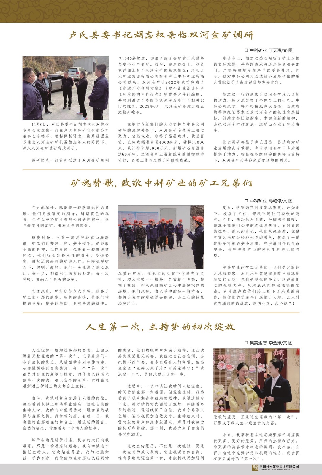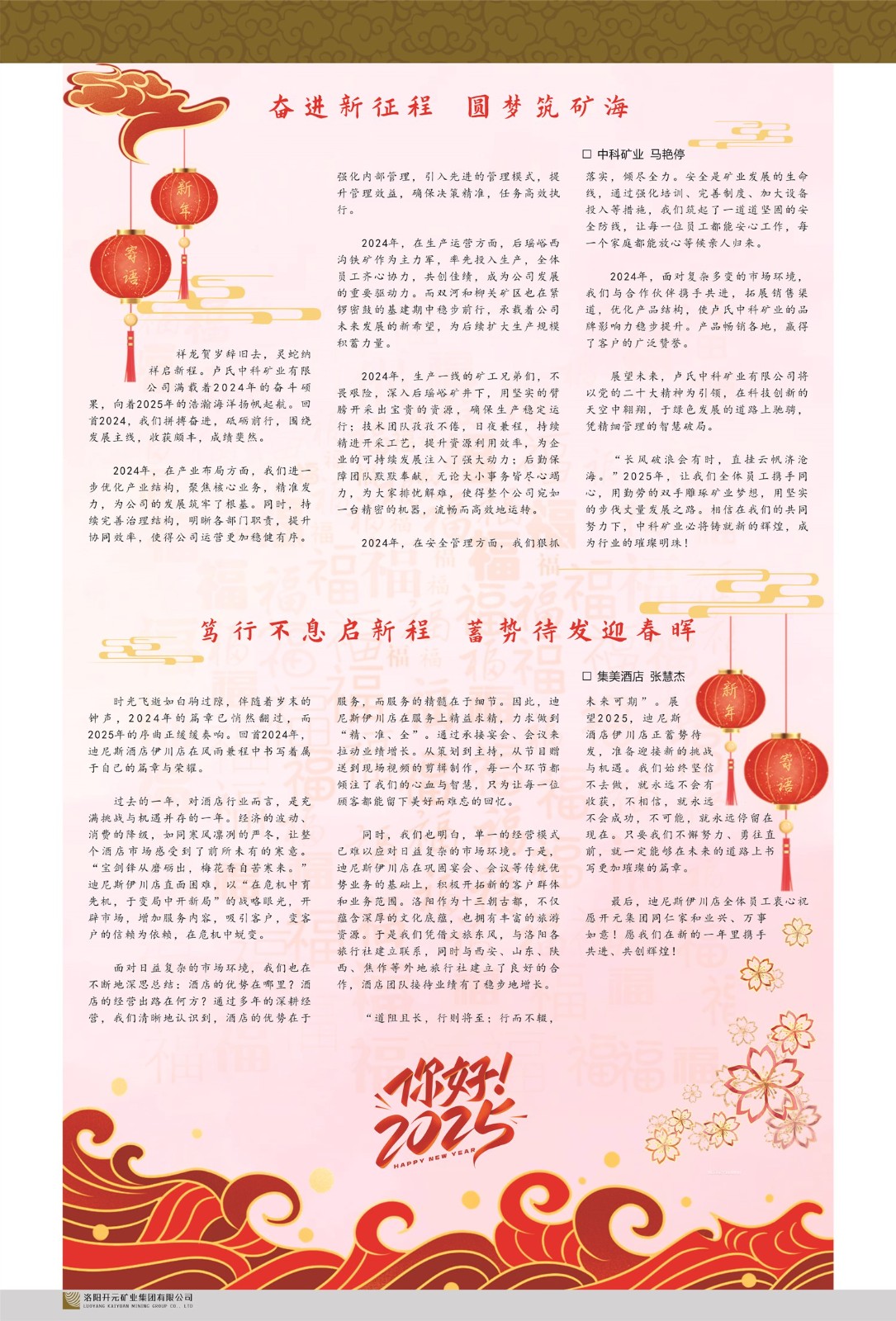 洛陽(yáng)開(kāi)元礦業(yè)集團(tuán)有限公司簡(jiǎn)介洛陽(yáng)開(kāi)元礦業(yè)集團(tuán)有限公司,始成立于2006年,位于洛陽(yáng)市開(kāi)元大道269號(hào)。集團(tuán)旗下共有十余家全資子公司,業(yè)務(wù)涉及有色金屬礦山開(kāi)發(fā)、礦產(chǎn)品購(gòu)銷(xiāo)與進(jìn)出口貿(mào)易、房地產(chǎn)開(kāi)發(fā)、文化藝術(shù)、企業(yè)管理與咨詢(xún)、資本投資等多個(gè)領(lǐng)域。2024年,集團(tuán)公司銷(xiāo)售總額達(dá)7.8億元。民建河南省委委員、民建河南省委企業(yè)委副主任、民建洛陽(yáng)市委委員、企業(yè)委主任、洛陽(yáng)民建企業(yè)家協(xié)會(huì)會(huì)長(zhǎng)許明月是公司創(chuàng)始人,現(xiàn)任洛陽(yáng)開(kāi)元礦業(yè)集團(tuán)有限公司董事長(zhǎng)。在礦業(yè)領(lǐng)域,洛陽(yáng)開(kāi)元礦業(yè)集團(tuán)擁有多家實(shí)力雄厚的子公司:貴州開(kāi)元礦業(yè)有限公司探、采礦權(quán)面積共11.33平方公里;興海縣銅鑫礦業(yè)有限公司探礦權(quán)面積8.76平方公里,礦山資源潛力巨大;2021年,開(kāi)元集團(tuán)與盧氏中科礦業(yè)有限公司開(kāi)展戰(zhàn)略合作。盧氏中科礦業(yè)有限公司專(zhuān)注于有色金屬的浮選、加工和銷(xiāo)售,擁有強(qiáng)大的技術(shù)支撐平臺(tái),是集探、采、選、冶、研為一體的中大型綜合礦業(yè)企業(yè)。目前,盧氏中科王家河1000噸選礦廠已成功投產(chǎn),雙河金礦、柳關(guān)欒盧鉛鋅礦相繼順利開(kāi)工,樓房銀礦與圪老灣鉛鋅礦的深部探礦重大突破,標(biāo)志著礦山版圖取得重大進(jìn)展,為開(kāi)元集團(tuán)后續(xù)發(fā)展奠定了堅(jiān)實(shí)基礎(chǔ)。在文化傳媒領(lǐng)域,洛陽(yáng)市明月美術(shù)館通過(guò)豐富多樣的藝術(shù)展覽、學(xué)術(shù)研討和公共教育活動(dòng),努力打造一個(gè)集展覽、交流、教育、研究為一體的綜合性藝術(shù)平臺(tái)。此外,在金融投資領(lǐng)域,開(kāi)元集團(tuán)旗下的北京明峰資本管理有限公司專(zhuān)注于投資具有高增長(zhǎng)潛力的優(yōu)秀企業(yè),特別是高科技、新能源、環(huán)保等新興產(chǎn)業(yè),為客戶(hù)提供個(gè)性化的資產(chǎn)配置服務(wù)。在做好企業(yè)經(jīng)營(yíng)的同時(shí),開(kāi)元集團(tuán)始終不忘企業(yè)的社會(huì)責(zé)任和家國(guó)情懷,以突出的愛(ài)心公益事跡,開(kāi)展了一系列公益慈善活動(dòng):“民建林”公益事業(yè)通過(guò)“思源基金”“幫幫公益”線上公益平臺(tái),與眾多愛(ài)心人士籌措資金20余萬(wàn)元;資助541名貧困大學(xué)生共計(jì)270余萬(wàn)元,推進(jìn)“數(shù)字助力——河南AI人才培養(yǎng)”;捐款10萬(wàn)元,馳援京津冀、黑龍江洪水地質(zhì)災(zāi)害……公司于2017年底被洛陽(yáng)市慈善總會(huì)評(píng)為“洛陽(yáng)慈善風(fēng)云榜——十大愛(ài)心集體”。洛陽(yáng)開(kāi)元礦業(yè)集團(tuán)有限公司秉承持續(xù)發(fā)展理念,憑借多年來(lái)良好的企業(yè)信譽(yù)與經(jīng)營(yíng)業(yè)績(jī),與全國(guó)多家企業(yè)建立了良好合作關(guān)系,受到社會(huì)各界的一致好評(píng),多次榮獲“納稅標(biāo)兵”“先進(jìn)企業(yè)”“招商引資模范企業(yè)”等榮譽(yù)稱(chēng)號(hào)?;赝麃?lái)時(shí)路,開(kāi)元人勠力同心,以“闖”的精神和“創(chuàng)”的勁頭,一路披荊斬棘,踏過(guò)千山萬(wàn)水;展望新未來(lái),開(kāi)元人凝心聚力,不執(zhí)于“舊”,無(wú)畏于“新”,秉承“勇于跨越,追求卓越”的企業(yè)精神,乘著國(guó)家高質(zhì)量發(fā)展新征程的東風(fēng),跨過(guò)高山,越過(guò)大海,向著集團(tuán)多元化、國(guó)際化的目標(biāo),逐夢(mèng)遠(yuǎn)航,跨越前行!