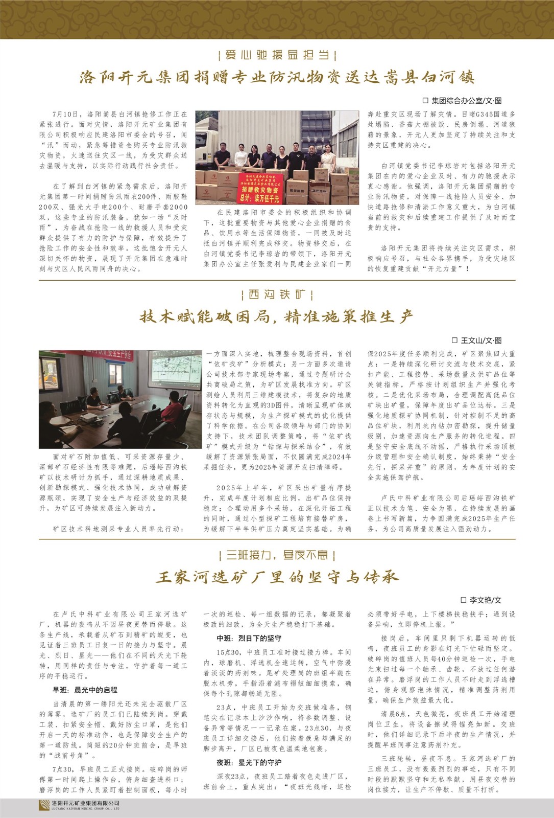 洛陽開元礦業(yè)集團有限公司簡介洛陽開元礦業(yè)集團有限公司,始成立于2006年,位于洛陽市開元大道269號。集團旗下共有十余家全資子公司,業(yè)務涉及有色金屬礦山開發(fā)、礦產品購銷與進出口貿易、房地產開發(fā)、文化藝術、企業(yè)管理與咨詢、資本投資等多個領域。2024年,集團公司銷售總額達7.8億元。民建河南省委委員、民建河南省委企業(yè)委副主任、民建洛陽市委委員、企業(yè)委主任、洛陽民建企業(yè)家協會會長許明月是公司創(chuàng)始人,現任洛陽開元礦業(yè)集團有限公司董事長。在礦業(yè)領域,洛陽開元礦業(yè)集團擁有多家實力雄厚的子公司:貴州開元礦業(yè)有限公司探、采礦權面積共11.33平方公里;興??h銅鑫礦業(yè)有限公司探礦權面積8.76平方公里,礦山資源潛力巨大;2021年,開元集團與盧氏中科礦業(yè)有限公司開展戰(zhàn)略合作。盧氏中科礦業(yè)有限公司專注于有色金屬的浮選、加工和銷售,擁有強大的技術支撐平臺,是集探、采、選、冶、研為一體的中大型綜合礦業(yè)企業(yè)。目前,盧氏中科王家河1000噸選礦廠已成功投產,雙河金礦、柳關欒盧鉛鋅礦相繼順利開工,樓房銀礦與圪老灣鉛鋅礦的深部探礦重大突破,標志著礦山版圖取得重大進展,為開元集團后續(xù)發(fā)展奠定了堅實基礎。在文化傳媒領域,洛陽市明月美術館通過豐富多樣的藝術展覽、學術研討和公共教育活動,努力打造一個集展覽、交流、教育、研究為一體的綜合性藝術平臺。此外,在金融投資領域,開元集團旗下的北京明峰資本管理有限公司專注于投資具有高增長潛力的優(yōu)秀企業(yè),特別是高科技、新能源、環(huán)保等新興產業(yè),為客戶提供個性化的資產配置服務。在做好企業(yè)經營的同時,開元集團始終不忘企業(yè)的社會責任和家國情懷,以突出的愛心公益事跡,開展了一系列公益慈善活動:“民建林”公益事業(yè)通過“思源基金”“幫幫公益”線上公益平臺,與眾多愛心人士籌措資金20余萬元;資助541名貧困大學生共計270余萬元,推進“數字助力——河南AI人才培養(yǎng)”;捐款10萬元,馳援京津冀、黑龍江洪水地質災害……公司于2017年底被洛陽市慈善總會評為“洛陽慈善風云榜——十大愛心集體”。洛陽開元礦業(yè)集團有限公司秉承持續(xù)發(fā)展理念,憑借多年來良好的企業(yè)信譽與經營業(yè)績,與全國多家企業(yè)建立了良好合作關系,受到社會各界的一致好評,多次榮獲“納稅標兵”“先進企業(yè)”“招商引資模范企業(yè)”等榮譽稱號?;赝麃頃r路,開元人勠力同心,以“闖”的精神和“創(chuàng)”的勁頭,一路披荊斬棘,踏過千山萬水;展望新未來,開元人凝心聚力,不執(zhí)于“舊”,無畏于“新”,秉承“勇于跨越,追求卓越”的企業(yè)精神,乘著國家高質量發(fā)展新征程的東風,跨過高山,越過大海,向著集團多元化、國際化的目標,逐夢遠航,跨越前行!